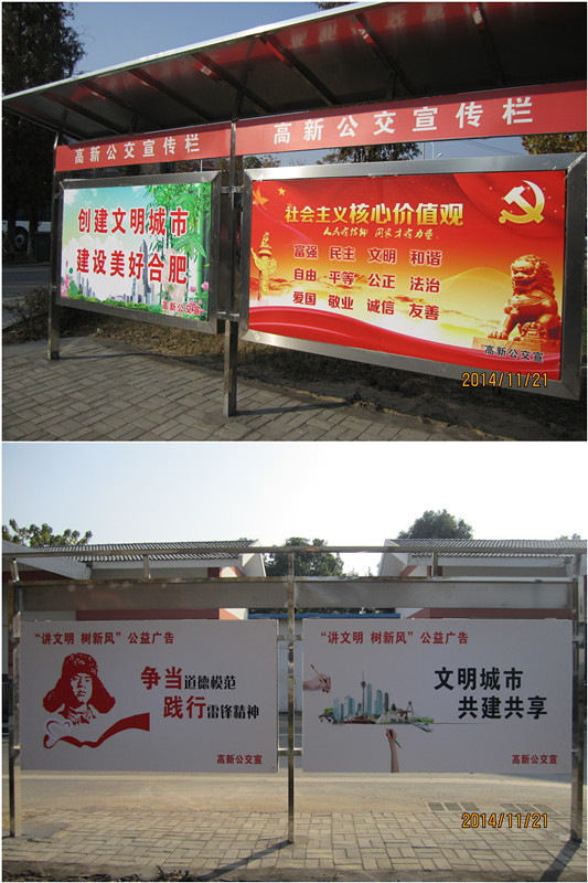 本月上旬高新公交開(kāi)福寺停保場(chǎng)內的文明宣傳欄已建設完成,屹立于停保場(chǎng)上格外引人注目。宣傳欄內,“講文明 樹(shù)新風(fēng)”、“社會(huì )主義核心價(jià)值觀(guān)”、“創(chuàng )建文明城市 建設美好合肥”、“爭當道德模范 踐行雷鋒精神”等宣傳標語(yǔ)向過(guò)往的駕駛員朋友們傳遞著(zhù)社會(huì )正能量,是弘揚傳承中華優(yōu)良傳統美德的重要載體。