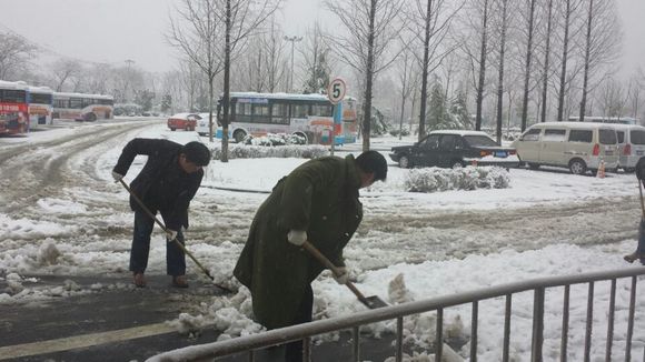 大雪雖大,卻影響不了同仁們的熱情,有的拿著(zhù)掃把,有的拿著(zhù)鏟鍬,都彎著(zhù)腰低著(zhù)頭努力的清掃著(zhù)公車(chē)的“必經(jīng)之路”;雪一直未停,不多時(shí),雪花就將他們身上的衣服裹成了白色,但這絲毫無(wú)法動(dòng)搖同仁們的信念——為奮戰在一線(xiàn)的員工和出行的市民開(kāi)辟出一條安全的道路。