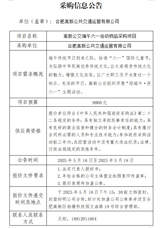 高新公交端午六一活動(dòng)物品采購項目信息公告