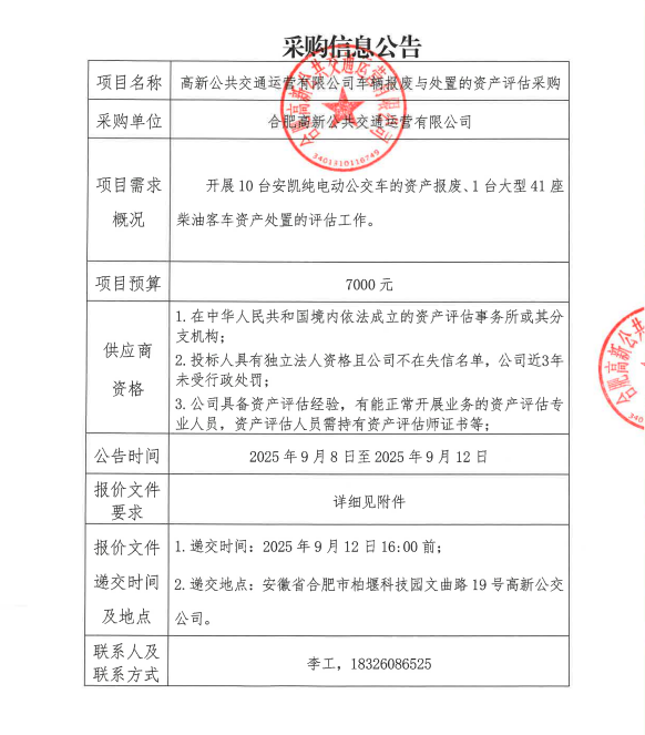 高新公共交通運營(yíng)有限公司車(chē)輛報廢與處置的資產(chǎn)評估采購信息公告