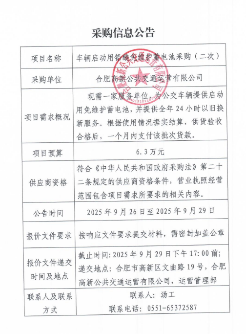 車(chē)輛啟動(dòng)用鉛酸免維護蓄電池采購信息公告(二次)